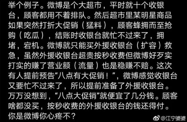 11月28日,被网友封为首个“国际西瓜物种保护日”,宜吃瓜,忌微博宕机。 这一天,恐怕也将载入新浪微博编年史。 因为11月28日不仅是新浪员工发薪的日子,也是新浪举办20周年纪念活动的日子。同一天,新浪作为美股上市公司也交出了第三季度的未审计财报。 但对于新浪微博的员工胡忠想@古月中心相心 来说,这一天的煎熬从凌晨开始。 【壹】 胡忠想是新浪微博的技术专家,以账号@古月中心相心 活跃在微博上。 他负责微博首页的信息流相关业务研发。 每当微博上出现或即将出现重磅新闻,网友们仍然会在其微博下提醒他为微博扩容,否则微博的服务器会承受不住继而网页崩溃。 11月15日,大V号@江宁婆婆 向网友解释什么是“微博扩容”。 久而久之,网友们都称他为“阿忠伯”,甚至有人因为他微博评论下各个来路的信息喊出了“跟着阿忠伯有瓜吃”、“关注阿忠伯吃瓜不迷路”的口号。 11月28日,原定于当天最大的热点应为TFBOYS组合中的易烊千玺过18岁生日。此前,在其他明星生日当天的零点,微博曾因粉丝发微博送祝福短暂崩溃过。 零点刚过,微博上的粉丝们纷纷发微博送上生日祝福。 00:24,胡忠想也转发了易烊千玺的微博,并嘱咐“不要着急谈恋爱”。 早在今年9月,有网友调侃称:如果TFBOYS组合成员公布恋情,微博以及各大娱乐论坛都会崩溃。当时“flag帝”胡忠想在微博评论称:“谁怂谁孙子,(TFBOYS组合)三个一起脱单最好”。 话是这样说,但胡忠想仍然时时刻刻关注着微博上流量明星们的动态,生怕谁哪天爆出来一个大新闻。 00:37,就在胡忠想转发易烊千玺微博13分钟后,一枚重磅炸弹从天而降。与知名歌手薛之谦有过感情纠葛的李雨桐再次发布微博。 早在2017年9月,薛李两人的感情纠葛曾在微博上引发超级热度。 胡忠想立时慌了,发微博称“明天好慌……不管怎样睡了[跪了]”。 虽然嘴上说着要睡,但是胡忠想仍然为此连发七条微博,才真正地不再在微博活跃。 【贰】 11月28日,新浪20周年纪念日。 从1998年创立以来,新浪已经历经20年的风风雨雨。现在,新浪不仅成为了大部分名人、媒体入驻的平台,更是成为了一家美股上市公司。 红星新闻记者查阅新浪第三季度财报发现:新浪于2018年第三季度的净收入为5.572亿美元,相较去年同期增长26%。其中,仅微博一项业务就带来4.602亿美元的净收入,微博的收入来源包括广告和营销以及微博增值服务。 新浪董事长曹国伟也称:“我们的营收和盈利在微博业务的持续势头驱动下均实现健康增长。” 微博早已成为新浪的重中之重,即便是新浪的内部员工,也都对微博爱不释手。 11月28日早上9时3分,胡忠想到达新浪位于北京的总部大厦,并晒出一张建筑物前红色“20”的装饰照片。 有意思的是,在这条微博的评论中,知名大V@江宁婆婆 提醒道:“现在扩容还来得及,别说我没提醒过你。” @江宁婆婆 的账号拥有者为南京市公安局江宁分局网安大队副大队长王海丁,也是江宁分局微博@江宁公安在线 的运营者。 不少网友都猜测江宁婆婆的公安系统身份让他提前知道了某些内部消息。在此之前,羽泉组合的陈羽凡涉毒一消息已经在微博小范围内传播开来,但无人敢断定真假。 事实上,微博作为在年轻人中极具影响力的平台,也被各方所看重。近年来各大政府机关纷纷入驻,尤其是公安机关在微博对涉毒、违法名人的独家信息曝光,既能掀起民众舆论,也能对所有人起到警示作用。 不少提前从其他渠道得知“陈羽凡涉毒”消息的网友都在等待北京市公安局@平安北京 发布微博。然而,官方微博没等到,率先进入吃瓜群众眼帘的是其经纪公司与本人的微博澄清与更新。 随着李雨桐的删博和来自陈羽凡的澄清,胡忠想的心或许暂时放了下来。他发微博称“虚惊一场”,转而关注起了足球。 【叁】 11月28日,从中午开始,微博连接被陈羽凡涉毒一事被坐实、胡海泉发博、蒋劲夫在日本被捕、薛之谦回应等消息轮番轰炸。 不少网友在胡忠想的最新微博下留言,催他赶紧扩容,不要让微博系统崩溃。 11月28日14时16分,胡忠想发布一条微博,“各个明星是给渣浪20周年献礼吗?都赶着一天。”微博末尾还缀上一个捂脸哭的“允悲”表情,大概只有这个表情才能表达他此刻的无奈。 在这条微博下方,他告诉吃瓜群众:“一直在扩容,别催了。”这一条评论获得了超过3000个赞。 为了防止新浪微博系统崩溃,每当出现大事件,流量洪峰会给微博的服务器带来巨大压力,但仅为了流量洪峰而常备平时会被闲置的以千计数的服务器,无疑会加大成本。 于是,每到这个时候,微博会向阿里云购买以使用时间收费的“扩容”——借用外部的计算能力减轻微博的压力。 红星新闻记者浏览阿里云官网发现,以华北1区1000台c5的64vcpu、64G的内存产品为例,每小时的价格为28813元。如果流量洪峰很大,所需的云服务器更多的话,价格还要再往上走。 此前,曾有网友好奇微博扩容一秒究竟要花费多少钱,@阿里云 官方微博给出了一个数字较低的价格,导致胡忠想被说成“卖惨”。胡忠想当即在微博回复称:“他说的是最低配,当然便宜。” 微博花在阿里云的钱占据了运营成本的一大部分。据媒体报道,“微博在介绍如何降低成本的时候,提及过‘在2016年,微博业务会在每天晚上做例行的阿里云动态扩容,晚上 8 点开始申请到晚上 12 点下线服务器’。” 就连微博CEO王高飞