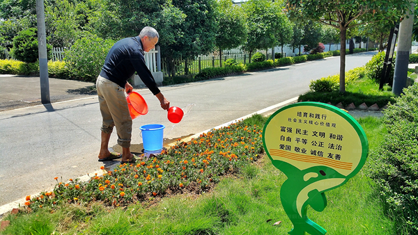 为路边花草浇水,爱护花草的钟爷爷心念屋场环境