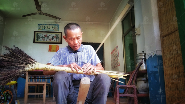 屋子里散落着高粱秆,60岁的钟美光坐在凳子上,手里拿着一束高粱秆,正将其用秆皮一圈圈捆扎好,准备做成扫帚。身旁的孙子,顽皮地耍弄着地上的高粱秆。