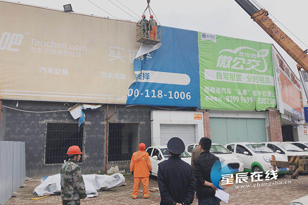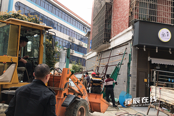 星辰在线3月28日讯(通讯员 谢雨轩 李文)在开福区月湖街道月湖社区农安小区一期14栋南侧有6块经营门店搭建的遮雨棚,左侧还有一处用于储存的铁皮屋,不仅影响市容,还存在一定安全隐患。3月28日,工作人员做通门店负责人思想工作后,推土机、货车到达现场进行拆除作业。