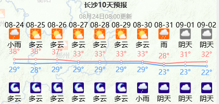24日至28日受冷空气和台风低压外围云系共同影响,省内有一次小到中雨天气过程。其中24日至25日湘南局地大雨,并伴有短时强降水、雷暴大风等强对流天气,过程期间气温下降,高温明显缓解。未来几天,长沙高温明显缓解,市民需继续做好防暑降温工作,保持良好心态,等待冷空气与雨水的到来。
