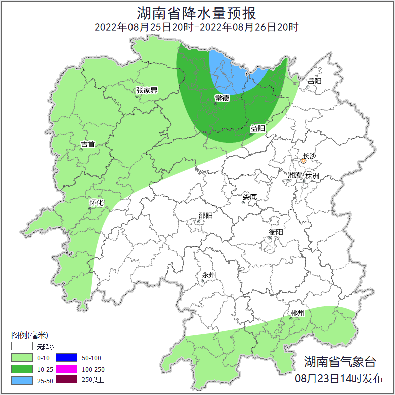 25日20时至26日20时,岳阳西部、益阳、张家界、常德、湘西土家族苗族自治州、怀化、永州南部、郴州南部阴天有阵雨或雷阵雨,其中常德、益阳北部、岳阳西部局地中到大雨,其他地区多云间阴天;最高气温32~34℃,最低气温23~25℃。