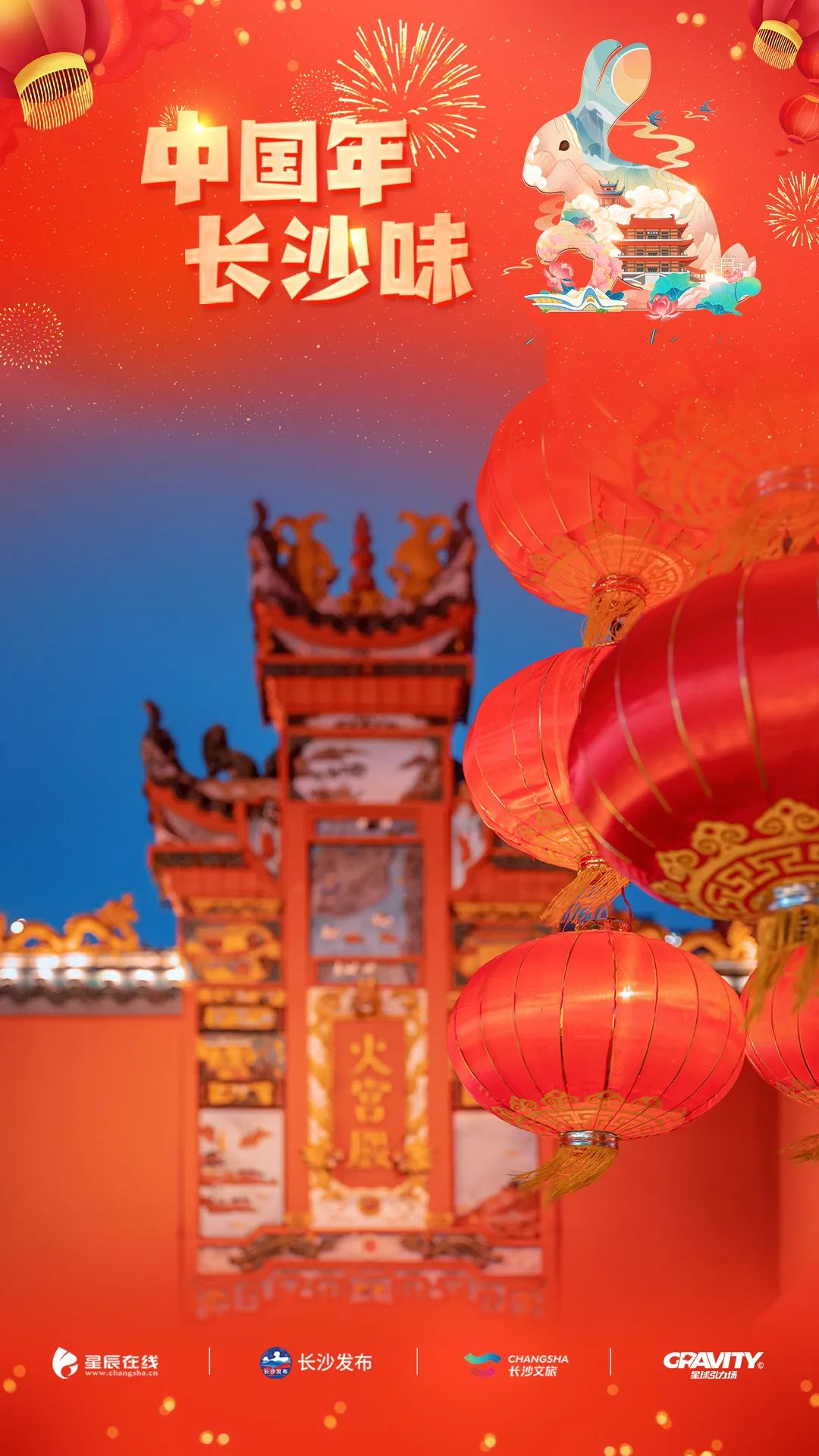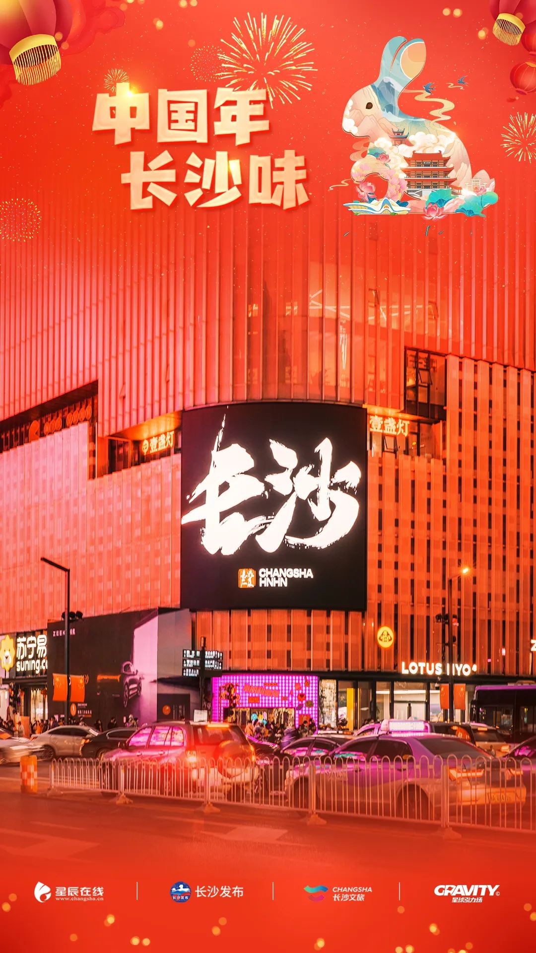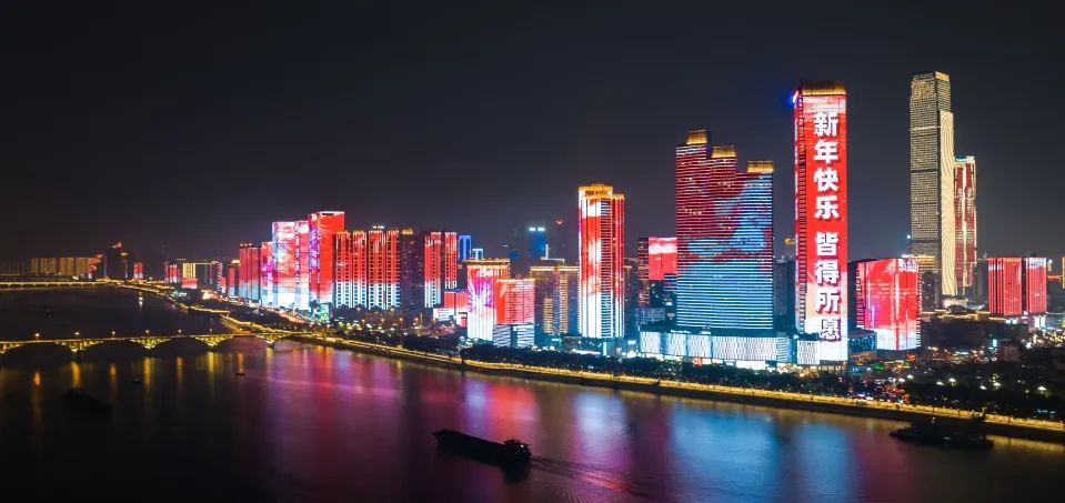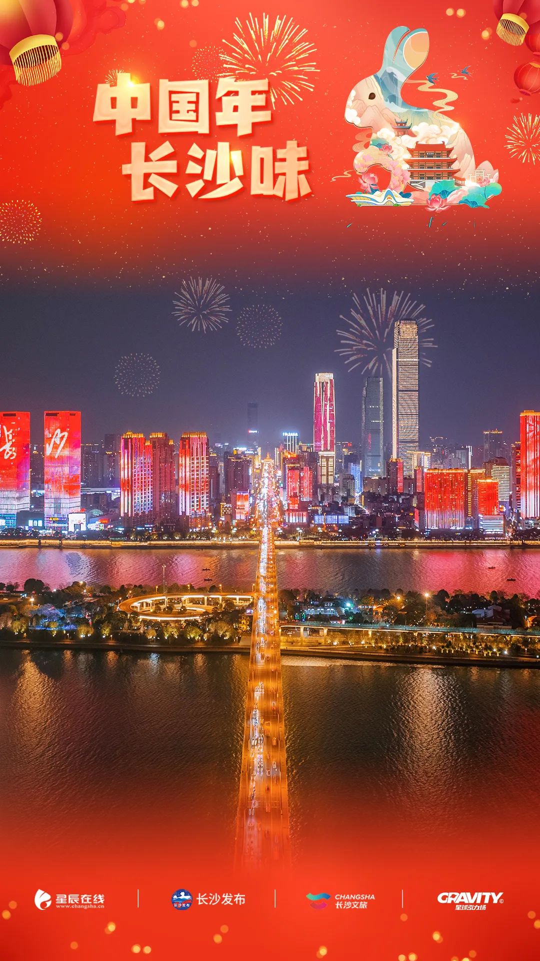 今年萌兔脚踏祥云,飞上湘江两岸的楼宇,敲鼓舞狮地为大家献上祝福啦。