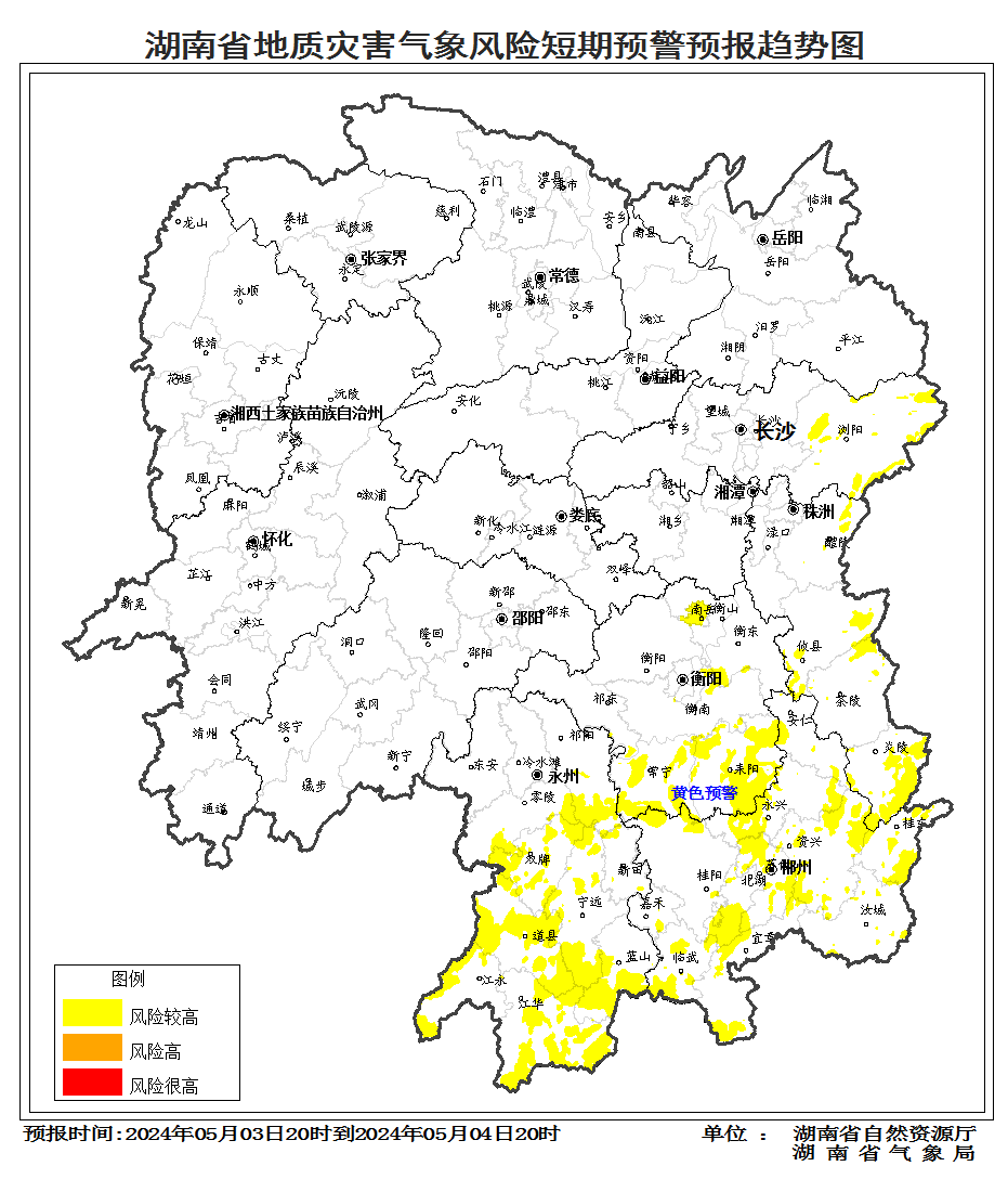 根据地质灾害成灾规律和孕灾条件,结合5月3日短期气象预报情况,省自然资源厅与省气象局联合会商得出如下结论:自5月3日20:00至4日20:00,受降雨影响,湘东、湘南大部分区域发生突发性地质灾害风险较高(黄色预警)。