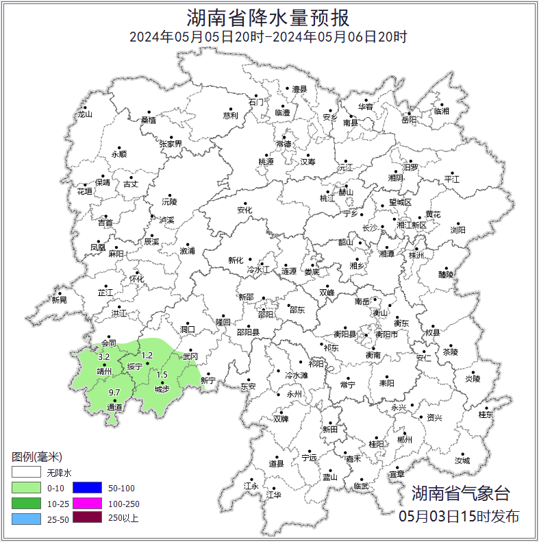 根据省气象局5月3日预报,省水利厅与省气象局联合会商得出如下结论:受降雨影响,3日20:00至4日20:00,长沙市东部、株洲市北部、衡阳市大部、邵阳市西南部、郴州市西部、永州市大部、怀化市南部等局地可能发生山洪灾害,衡阳市西南部、郴州市西北部、永州市西部和东部局地等发生山洪灾害的可能性较大,永州市西南部等局地发生山洪灾害的可能性大。