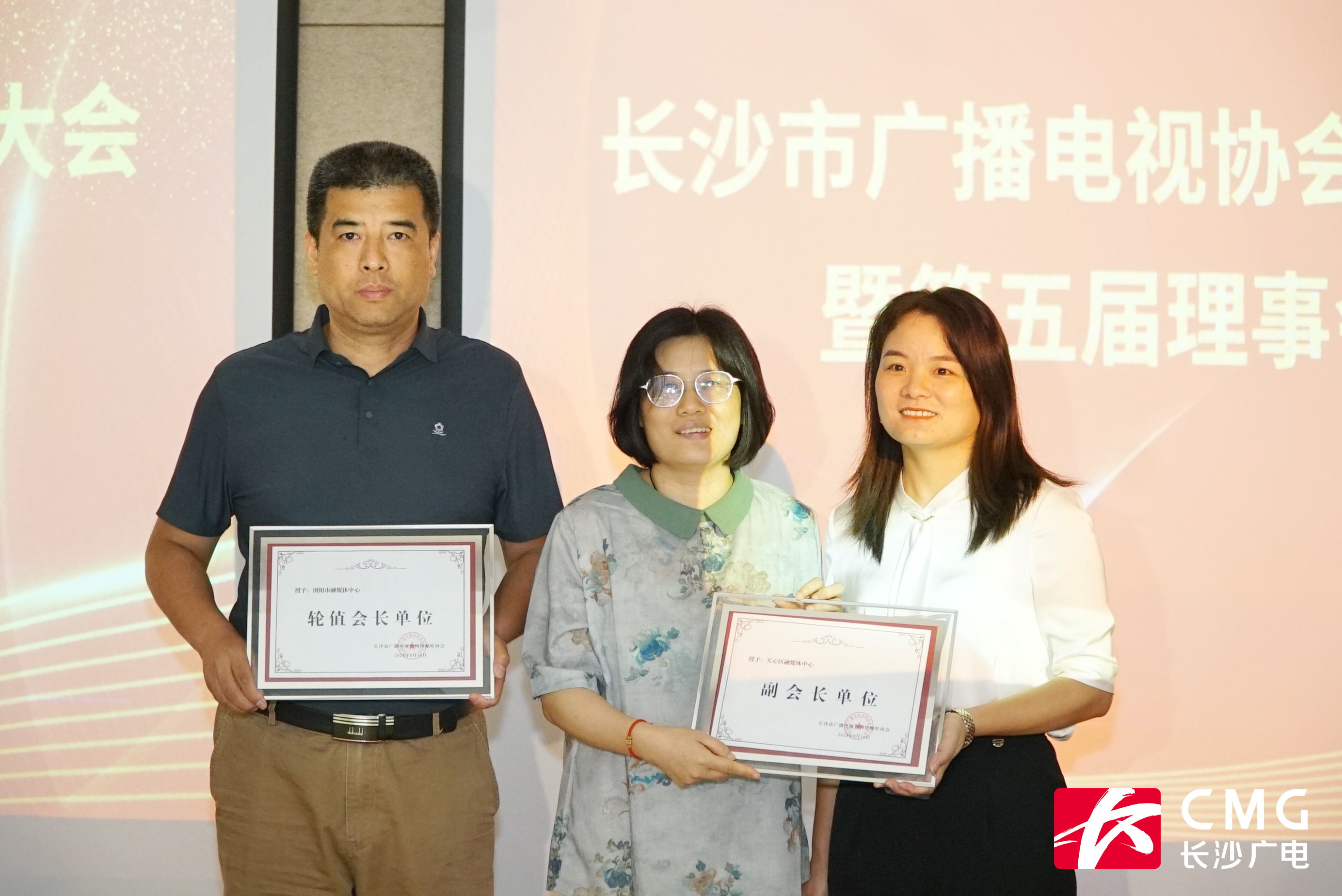 (湖南省新闻工作者协会秘书长陈双,向轮值会长单位——浏阳融媒体中心授牌,向副会长单位——天心区融媒体中心授牌。)