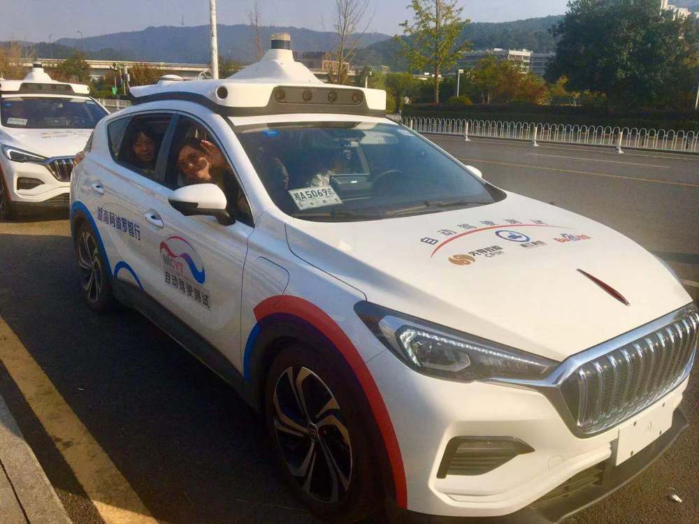 (湖南长沙市街头的无人驾驶汽车和试乘人员。新华社记者曹国厂摄)