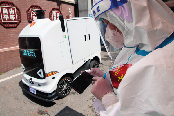 2022年4月7日,长沙市雨花区东塘街道枫树山社区,志愿者为无人车设置运送路线 陈思汗摄 / 本刊