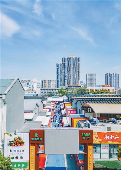 漫步湖南湘江新区观沙岭街道的长沙锦秀拾光街区,时光仿佛慢了下来。咖啡店、网红餐厅一家接一家,不少市民游客前来打卡。步行几百米,来到占地1.44万平方米的锦尚生鲜市场,烟火气扑面而来,市场日均客流量约3万人,覆盖周边数十个社区。