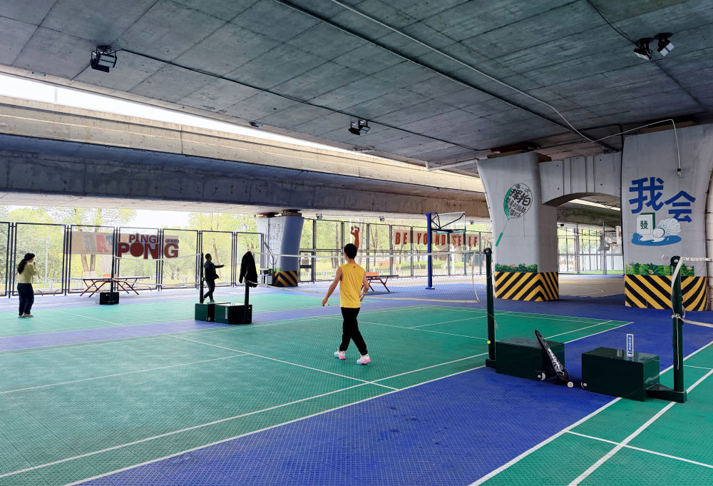 在长沙湘府路大桥西侧,击打羽毛球的清脆声响与桥上的车流声交织,桥墩上的体育主题涂鸦营造出浓厚的运动氛围。这里原本是一处停车场。2025年3月,该区域在保留停车功能的同时,划出一半空间,改造成羽毛球、乒乓球、篮球、五人制足球等运动场地。