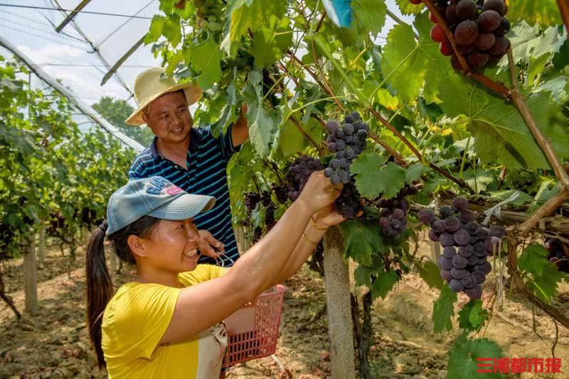 初秋时节,瓜果飘香。9月5日,记者在浏阳市古港镇罗富根的水果基地看到,发紫的葡萄、红彤彤的火龙果、金灿灿的柿子,硕大饱满的果实挂满枝头,散发出沁人心脾的气息。