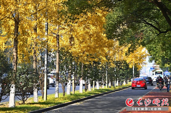 与芙蓉路的银杏金黄色调不同,开福大道两边的枫叶红得似火,潇湘路、滨河路两边成排的法国梧桐,以及城南东路上的栾树则呈现出橙黄色,十分养眼。一条条特色鲜明的五彩道路,为城市增添靓丽色彩,充分展现出山水洲城的生态之美。