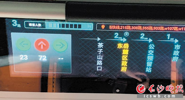 该车车厢内有一块显示屏,屏上会实时显示到达下一站的时间和到达终点站的时间。比如,车辆启动前,显示屏上显示的是:当前站恒大华府,开往海洋半岛方向,抵达终点需83分钟。公交车启动后就会显示每一个站点以及到各站点所需要的时间,比如坦金路口站到佑母塘路口站需要2分钟,市妇联站到岳麓教师村站需要3分钟。记者用计时器计算了一下,公交车运行所花时间与显示屏上显示的时间基本一致。