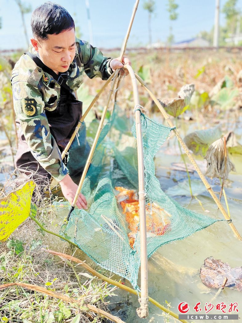 李德军创新的“寻丝觅缝”,远不止折腾秸秆废柴。“别看这个季节荷塘一片凋零,水底下都是宝贝。”记者随他一同穿上连体雨裤,跳进一米多深的荷塘,一抄网下去,阳光下,起出的网里一片“碎金”:巴掌大小的金色、橙红色的小鲤鱼活蹦乱跳。