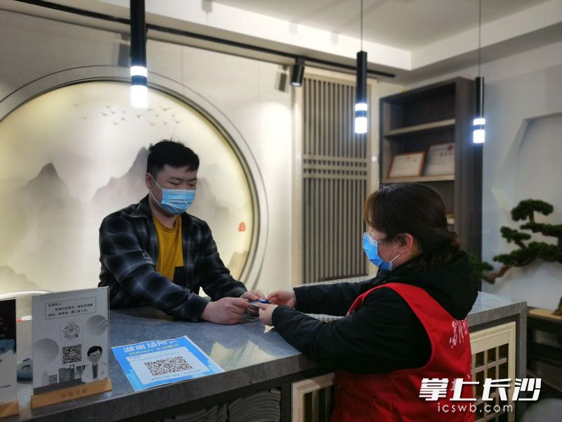 九峰苑志愿者协助社区登记居民出入信息。长沙晚报全媒体记者 王斌 摄