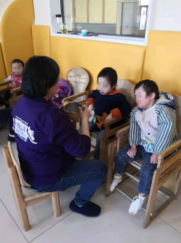 喂孩子吃饭时,蒋志文发现有几个孩子具备自我进食的能力,但一开始,孩子们不知如何握勺,动作更是五花八门,饭菜往往难以入口。这个时候,她就坐在孩子们身边,耐心地手把手地纠正每个孩子的握勺姿势,期间,孩子们笨拙的学习姿势常常弄得她全身都是饭粒。在她的悉心指导下,这些孩子们逐渐学会了自我进食的本领。看到他们从容地用勺子从碗中舀起米饭,再稳稳地送入口中,一旁的蒋志文笑得格外开心。