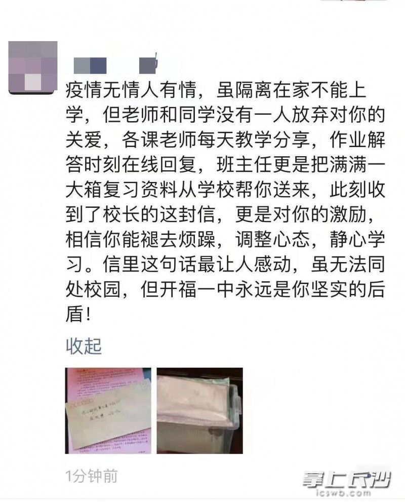 “亲爱的学生,人生路上,有风有雨是常态,风雨无阻是心态,风雨兼程是状态。天欲降大任,必先苦其心志。但疫情阻挡不了春天的脚步,愿你于磨难处淬炼意志、在彷徨中坚守初心。相信经历了这场特殊的人生洗礼,在今后的成长中,大家一定无惧风雨,不负青春。”事情发生后,开福区第一中学校长阮南阳写下《致被隔离学生的一封信》,在信中,他鼓励学生们坚定战胜困难的信心,成为最好的自己。