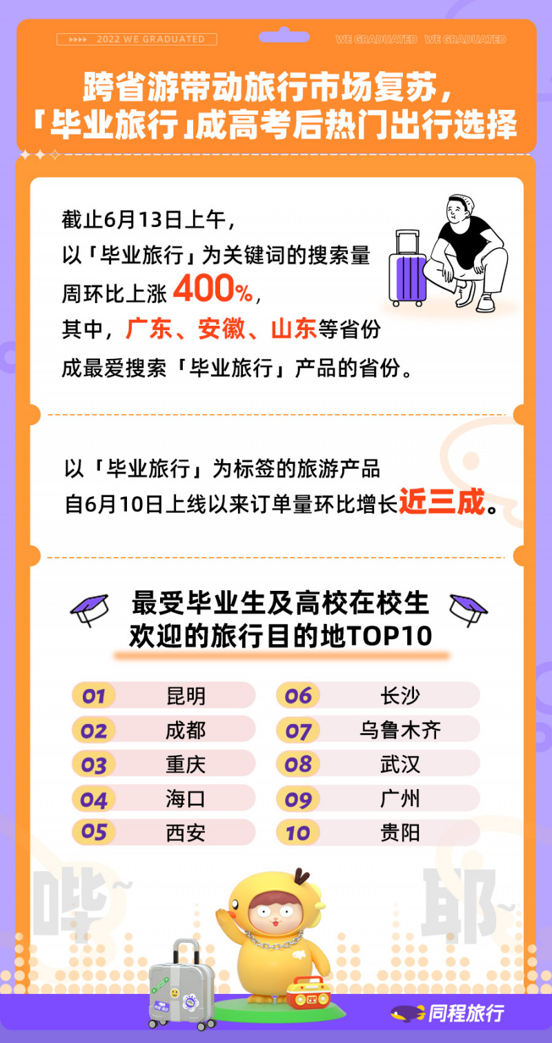 考试结束后,去哪里玩成了毕业生们关注的重点。同程旅行平台数据显示,在旅行目的地的选择上,昆明、成都、重庆、海口、西安、长沙、乌鲁木齐、武汉、广州、贵阳等颇受不同年龄段毕业生的喜爱。对于毕业生群体来说,这些城市的吸引力在于,本身拥有丰富的文旅资源,同时也是互联网世界具有较高人气的“网红”目的地。