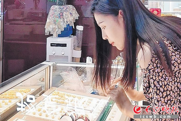 店内,市民李先生正在帮妻子从心仪的两款项链中做出选择。“送她喜欢的东西就是表达爱意的最好方式。”他告诉记者,他们已经结婚20多年了,日子精打细算,相对来说每年的七夕金饰市场都会给出平日没有的优惠,所以他们特意选在这个时间段来挑选礼物。