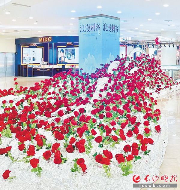 长沙王府井百货河西店营造出“浪漫刺客”主题,10米倾泻而下的冰川玫瑰让浪漫更多了一个打卡地。“其寓意是让玫瑰在冰川雪水之上盛开,破冰而出的玫瑰更添了一份温暖与蓬勃的生机。”现场工作人员介绍,这也是商场在七夕给消费者专门打造的温馨、新鲜的体验。