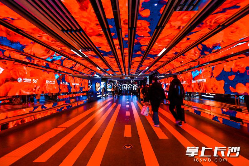 五一广场地铁站3A出口,如隧道一般的LED矩阵和“长沙”字样的异形屏一直是年轻人和游客朋友喜爱的打卡点,特别的造型让同款“爱心”更具浪漫的冲击感。
