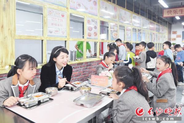 “长沙童谣墙”的对面,是一个书架,摆放着一本本适合孩子们阅读的书,很多孩子吃完中餐后就会来这里看看书。旁边则是同学们最喜欢的“美食翻翻墙”,墙上是一块块可以翻动的美食标牌。“学校每周根据‘仰实智评APP’选出一个得分最高的学生,由他来选择翻哪一块美食牌。他选中的那道美食,第二天就有望出现在同学们的餐盘里。”唐玲娟说,学校还推出了“和校长妈妈共进午餐”活动,每天安排一位校长(副校长)和孩子们在一起吃饭,一起聊聊最开心、最有趣、最期待的事。