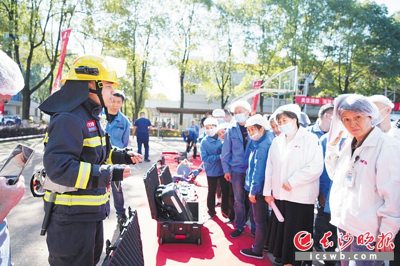 在长沙的园区企业,员工参观消防救援装备,消防员认真讲解。长沙晚报通讯员 张佳欣 全媒体记者 刘琦 摄影报道
