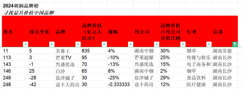 长沙有5家品牌上榜,分别是排在113位的芒果TV(95亿元)、143位的兴盛优选(70亿元)、146位的白沙(65亿元)、并列第248位的益丰大药房以及盐津铺子(30亿元)。