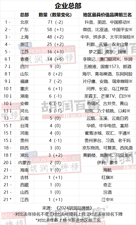 记者梳理此次榜单发现,企业总部分布前五名与去年相同。分地区来看,总部在北京的最多,有71个,比去年减少2个;广东第二,有58个,比去年增加1个;上海第三,有48个,比去年增加2个;浙江第四,有25个,比去年增加2个;江苏第五,有16个,比去年增加3个;香港以14个品牌位列第六,比去年增加6个。湖南排在第十,有6个,其中常德的芙蓉王以835亿元的品牌价值排在11位。