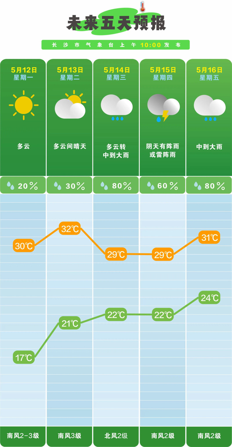 长沙市气象台预计,未来一周先晴后雨,气温偏高。预计12日,长沙晴天,气温17℃至30℃;一直到14日白天,晴天到多云;14日晚到15日,受弱冷空气和低层切变影响,有一次较强降雨过程;16日到18日,受高空波动及低层切变线影响,有中到大雨。意味着,天气舞台将由雨水掌控,雷雨、中雨、大雨将轮番“上阵”。