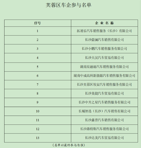 此次活动得到了众多车企的积极响应,共有拓速乐汽车销售服务(长沙)有限公司、长沙蔚澜汽车销售有限公司、长沙小鹏汽车销售服务有限公司等多家知名汽车销售企业参与(完整名单以最终参与为准),为消费者提供了丰富多样的购车选择。