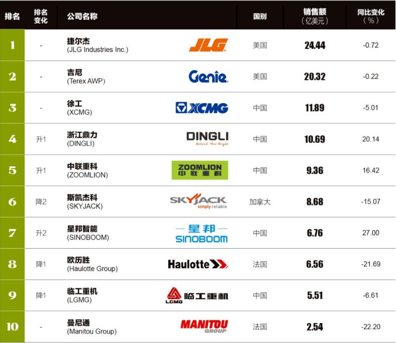 中联重科以销售额9.36亿美元、同比增长16.42%排名榜单第5位,较去年提升1位。公司在高空作业机械的研发和制造具备雄厚的技术基础,其中长臂架伸缩平稳控制技术、工作平台快速高精自动调平技术、臂架成形高精度控制技术、多载荷防倾覆控制技术、疲劳可靠性设计及测试技术、物联网与云平台应用技术等均已成功应用于高空作业平台产品。
