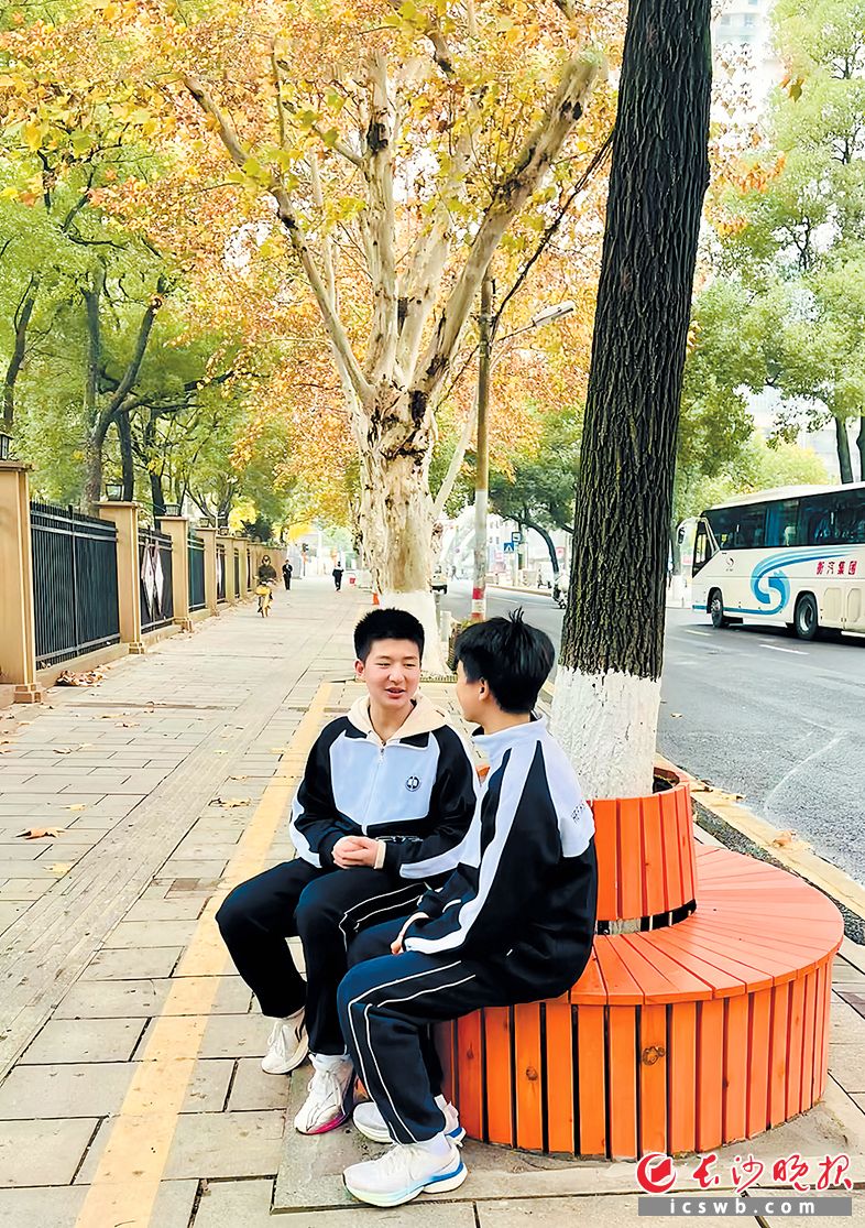 “最美梧桐路”上,鲜亮的橘色环保木椅成为一道风景。长沙晚报全媒体记者 李卓 摄