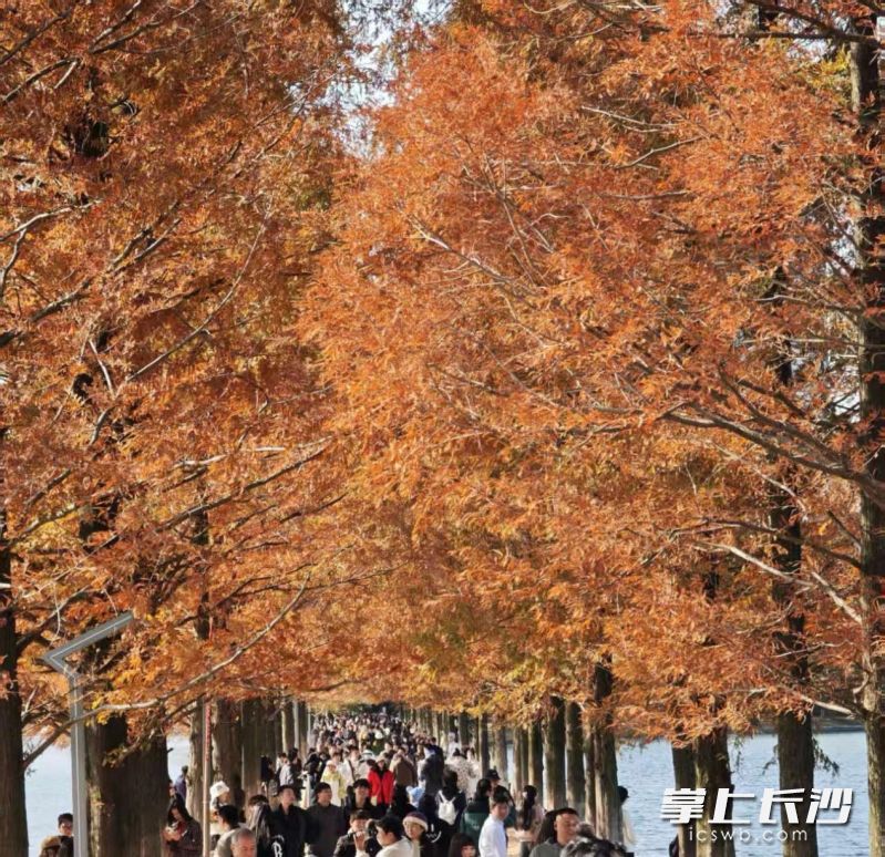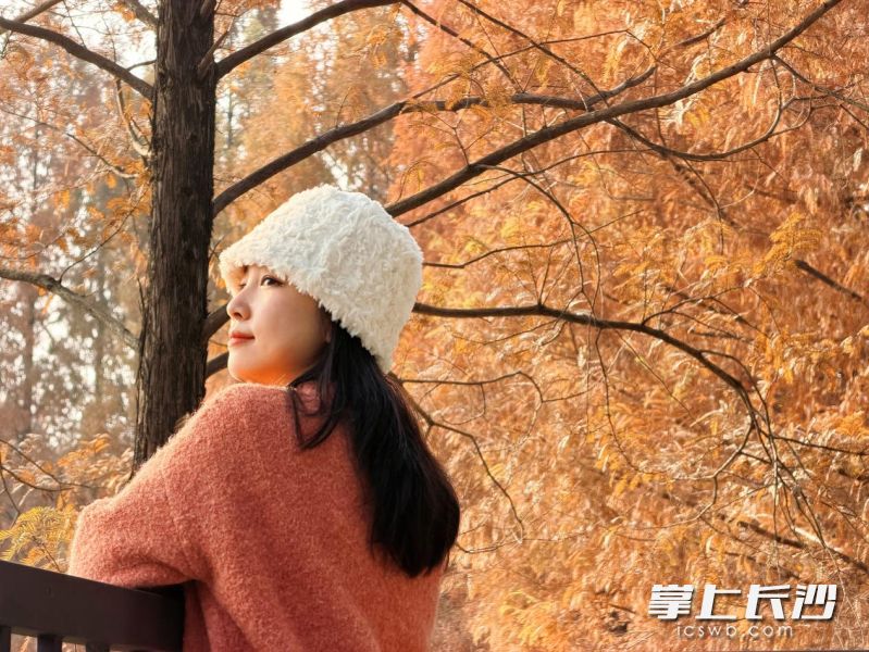 长沙园林生态园临湖亦有水杉。作为“当季顶流”——晨光一照,锈红树冠集体探向水面;在水杉林里随便一站,手机便自动开启“杂志封面”模式。这片湖,被不少网友认证为“冬日第一站红色打卡点”。