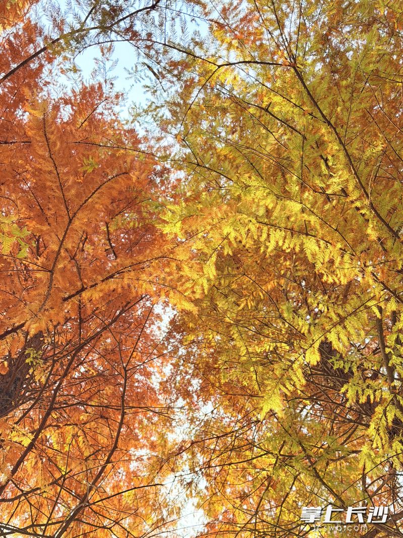长沙园林生态园的落羽杉,一旦“点火”就是整片天空的倒影。远远望去,那笔直参天的水杉林,已换上了一身渐变色的华服。阳光穿透层层叠叠的针叶,留下温暖而透明的光晕。