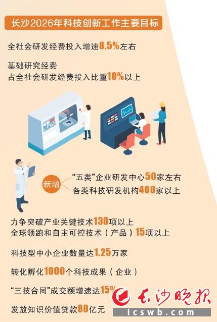 全社会研发经费投入增速8.5%左右;基础研究经费占全社会研发经费投入比重10%以上;新增“五类”企业研发中心50家左右、各类科技研发机构400家以上;力争突破产业关键技术130项以上、全球领跑和自主可控技术(产品)15项以上;科技型中小企业数量达1.25万家;转化孵化1000个科技成果(企业);“三技合同”成交额增速达15%;发放知识价值贷款80亿元……一个个目标数字,彰显出长沙向“新”而行的坚定决心。