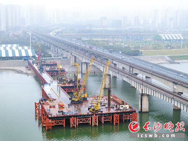 记者在现场看到,与长沙湘江铁路特大桥施工现场紧邻的便是石长铁路大桥,不时有列车呼啸而过。据了解,长沙湘江铁路特大桥主桥左线中心与既有石长铁路二线中心水平间距仅约33.67米,施工组织难度与安全风险极高。