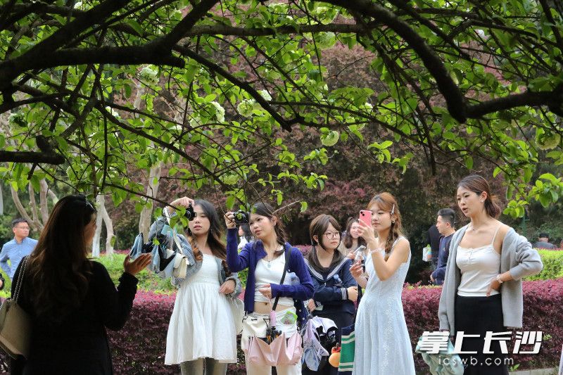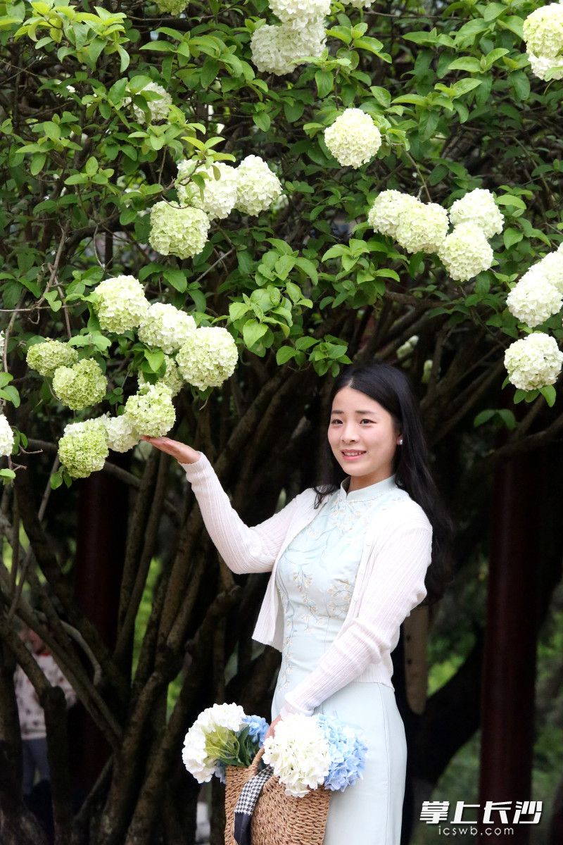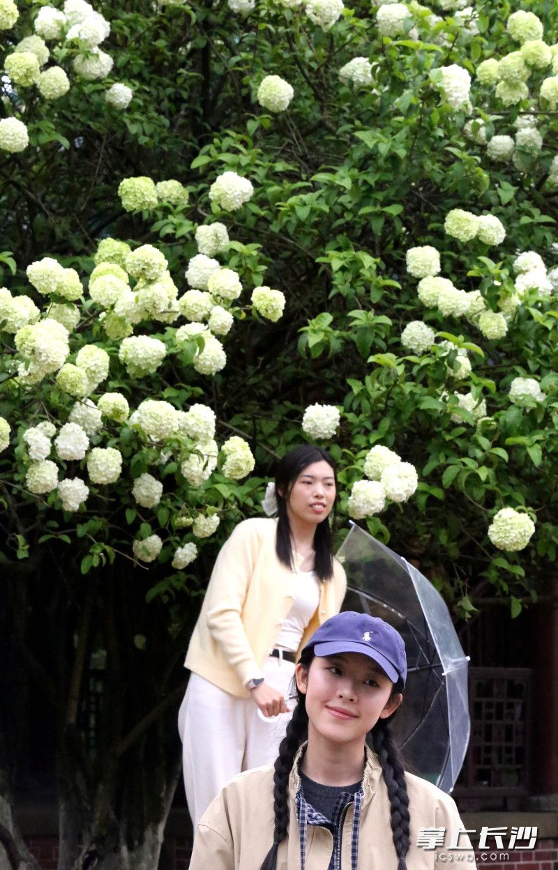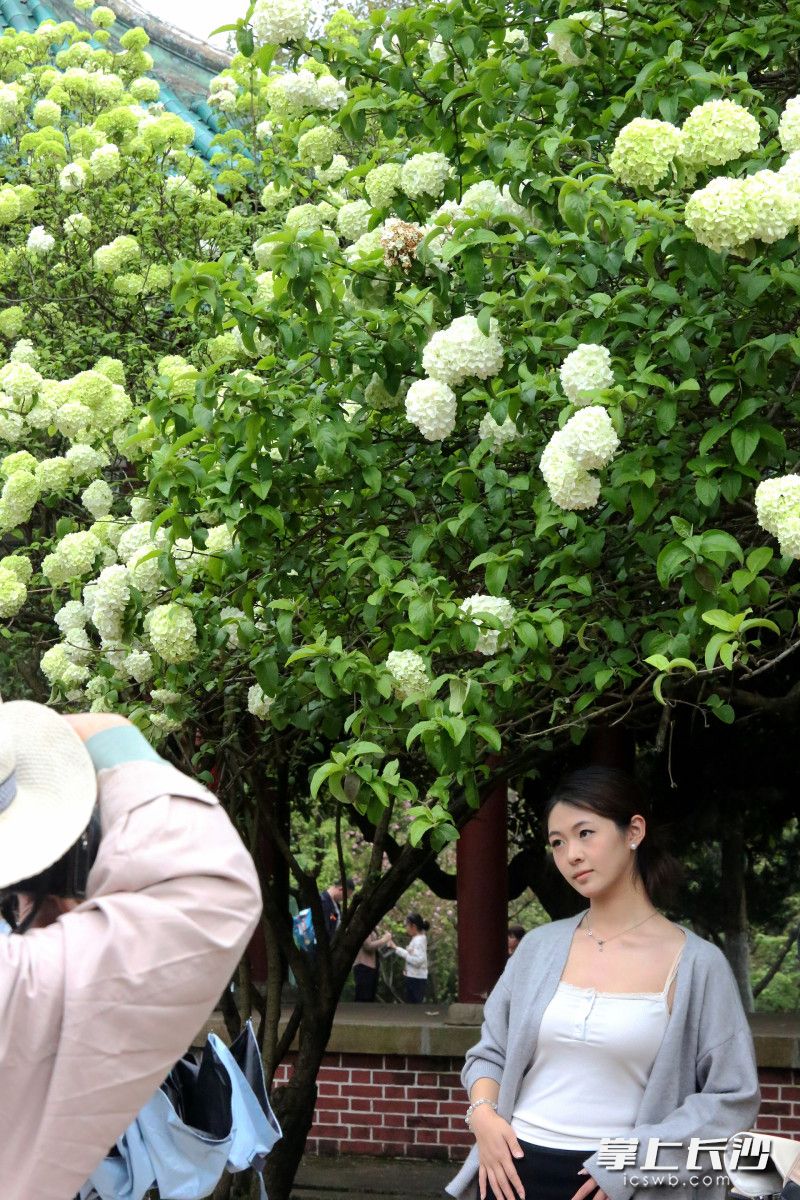 星辰在线4月7日讯 据长沙晚报掌上长沙(全媒体记者 贺文兵)报道,7日,湖南烈士公园内木绣球迎来盛花期,绿白相间的花团缀满枝头,与纪念长廊、古风亭台相映成趣,不少市民前来赏花打卡。木绣球花期可持续至4月中旬。