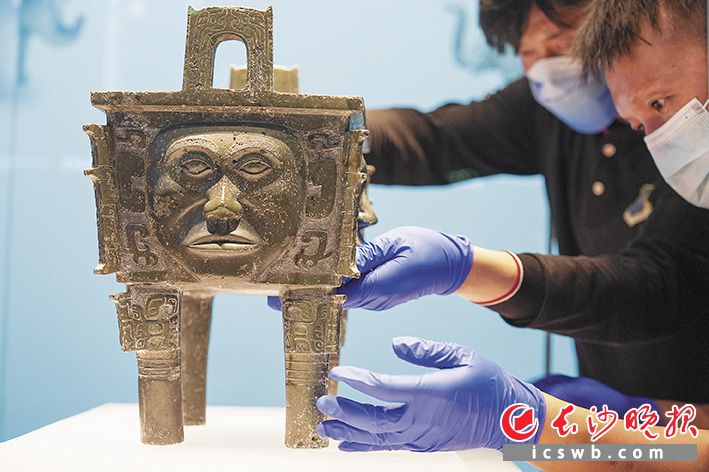 星辰在线4月27日讯 据长沙晚报掌上长沙(全媒体记者 郭雨滴 柳静芸)报道,4月26日上午,“美的历程——湖湘文化艺术展(二期)”文物开箱仪式举行,湖南省博物馆镇馆之宝——人面纹方鼎在梅溪湖艺术博物馆7号展厅亮相,成为活动焦点。