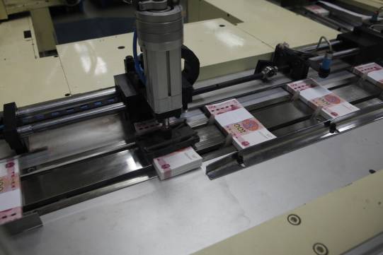 检封工序:来到人民币生产加工的最后一步了,这里要将印码完成品按照冠字号码排排好,然后利用裁封自动线进行裁切、打捆、塑包,这个过程中还要进行抽查,将瑕疵品剔除出去。钞票大张等待裁切(哦天哪,好想在上面打滚……)↓↓↓
