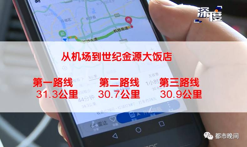 随后牌照为湘AT0348的出租车,来到了黄花机场的出租车候客区,准备排队接回头客。我们的另一组记者迅速坐了上去。这次记者选择了另一条线路,从黄花机场到湘江世纪城附近的世纪金源大饭店,为了了解距离,记者通过手机导航软件查出了三条行车线路,行车距离分别是31.3公里,30.7公里和30.9公里。