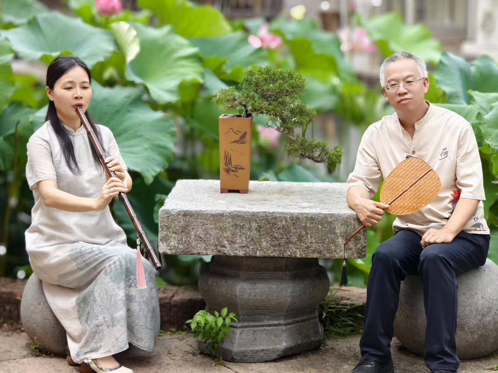 于安全(右)与洞箫演奏家董丽辉(左)共同演绎《大暑》