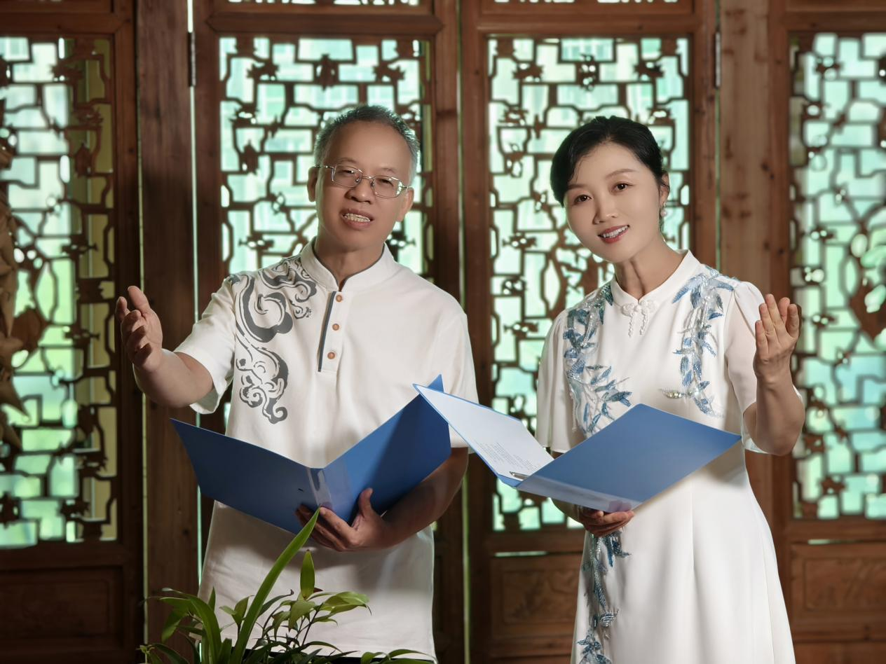 潇湘诗会“诗歌义工”、朗诵达人周青梅(右一)、于安全(左一)现场合诵