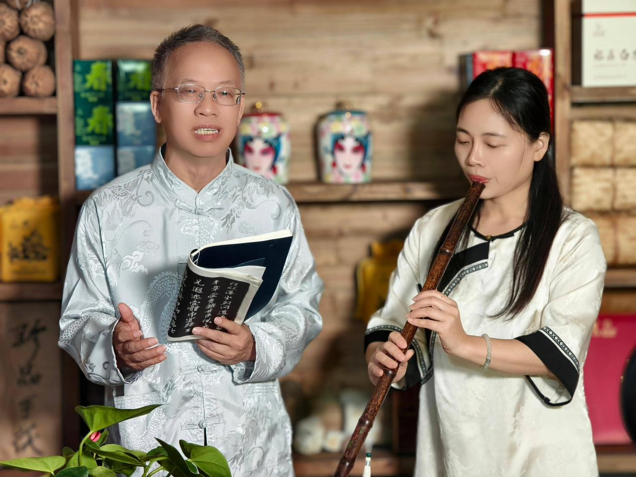 诗人胡述斌创作的《忻境·秋》诗中“金黄的时节,青色的情愫不让黑的追赶”,用红茶和黑茶的特性与季节巧妙关联,对秋天的到来进行了深邃而富有哲思的诠释。于安全老师以浑厚而富有磁性的嗓音,将诗中蕴含的秋日思绪与人生感悟演绎得淋漓尽致,令人回味无穷。