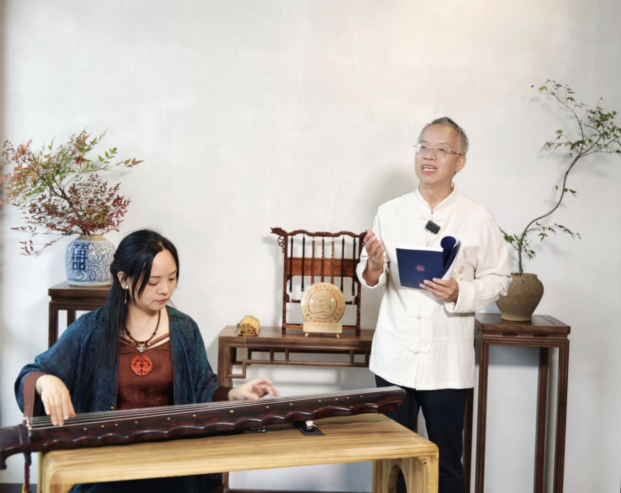 “霜降/是晨雾凝霜铺就的银白信笺/是秋叶染金写成的浪漫诗行……”活动伊始,朗诵达人、潇湘诗会“诗歌义工”周青梅、于安全合诵《你好,霜降》,两位声音抑扬顿挫,饱含深情,仿佛将现场观众带入了一个银霜铺地、空气澄澈的诗意世界。于安全朗诵经典词作《采桑子·重阳》,在古琴演奏家梁英姿清越悠远的《流水》琴音中,更显意境开阔,壮志昂扬。