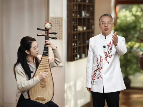 于安全(右)与青年琵琶演奏员王宇昕(左)现场表演