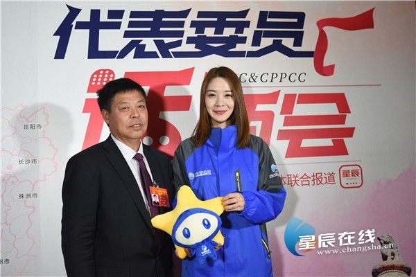 (廖仁旺代表<左>和全国两会湖南14市州新媒体联合报道团记者合影。除标注外,图片均由 黄超/摄。)