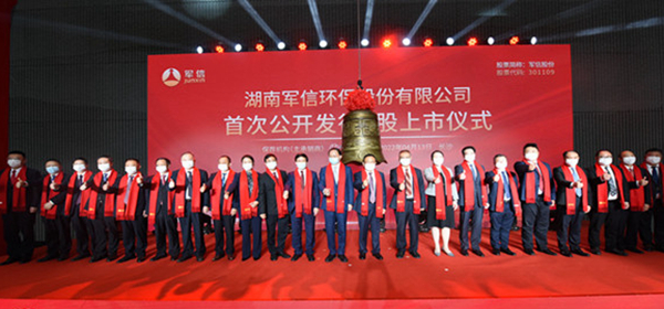 长沙市委副书记、市长、湖南湘江新区党工委书记郑建新,湖南证监局党委书记、局长李宇白,全国政协常委、民进湖南省委会主委、湖南省生态环境厅副厅长潘碧灵等领导与军信股份董事长戴道国共同敲响上市宝钟。