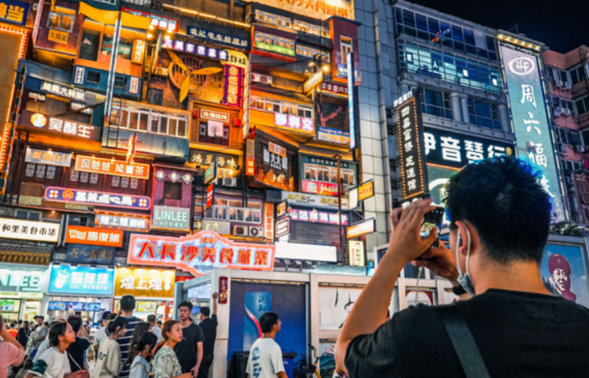 ▲ 太平老街、黄兴南路步行街、坡子街民俗名食商业街、解放西路酒吧一条街等商业“金名片”,超级文和友、茶颜悦色等打卡地彰显着“网红长沙”的夜间魅力。(图片来源:天心区委宣传部)