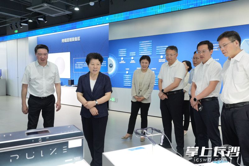 7月10日,省委常委、市委书记吴桂英在马栏山视频文创产业园调研,走进马栏山文化和科技融合展厅。